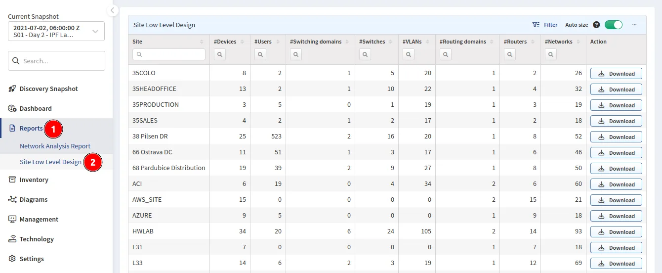 Reports → Site Low Level Design documents provide a snapshot of the network state from the selected Site and provide sufficient information for reconstruction.