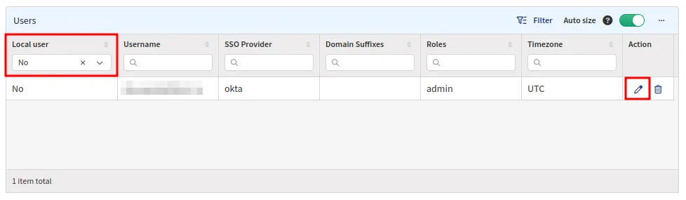 Userstable and click the Edit icon. (Optionally, you may selectNoin theLocal usercolumn header to show only non-local users.) -