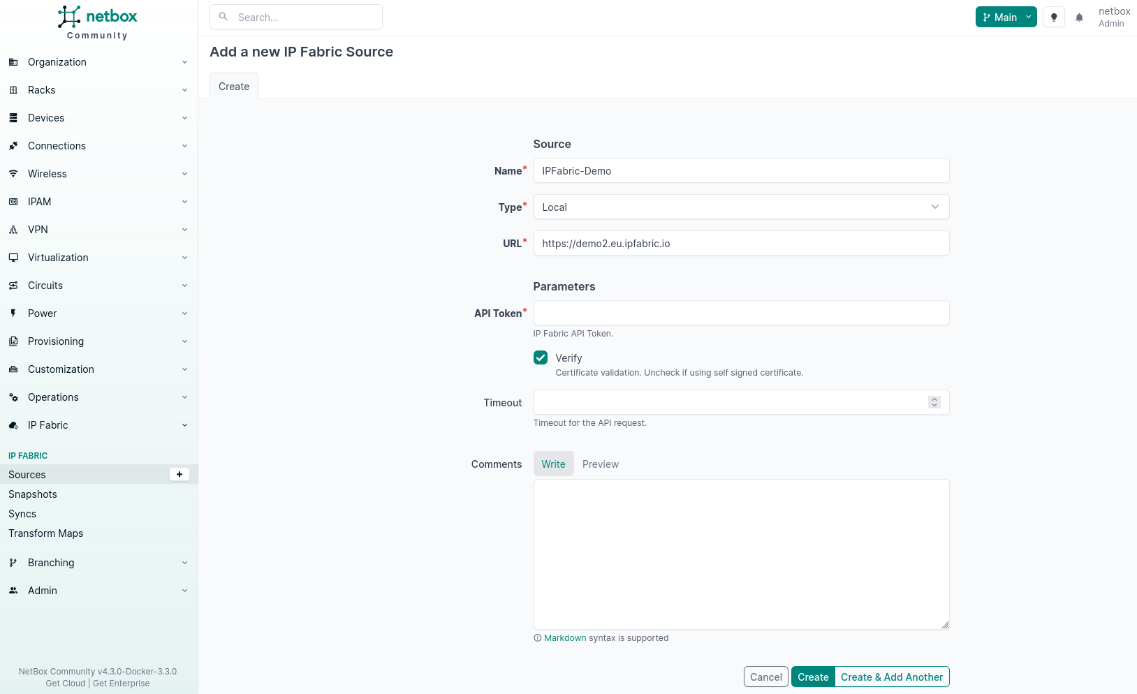 To create a source, navigate to Plugins → IP Fabric → Sources → [ + ]. In our case, the source is set to Local. If type is set to Remote, data for the snapshots will need to be pushed via API. The API endpoint to do this can be seen in the NetBox OpenAPI spec.