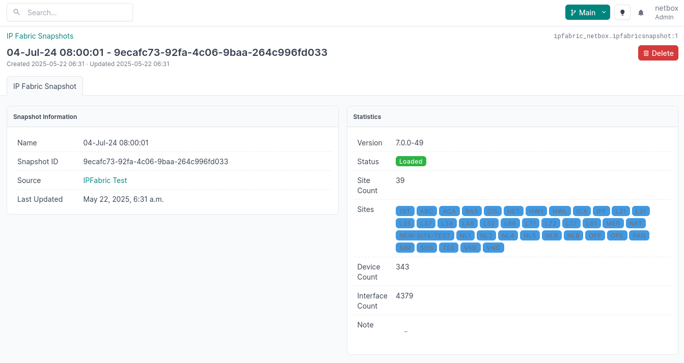 This information is used when creating a sync to determine the snapshot and site to synchronize from IP Fabric to NetBox. This page also contains the raw JSON for the snapshot that is returned via the IP Fabric API.