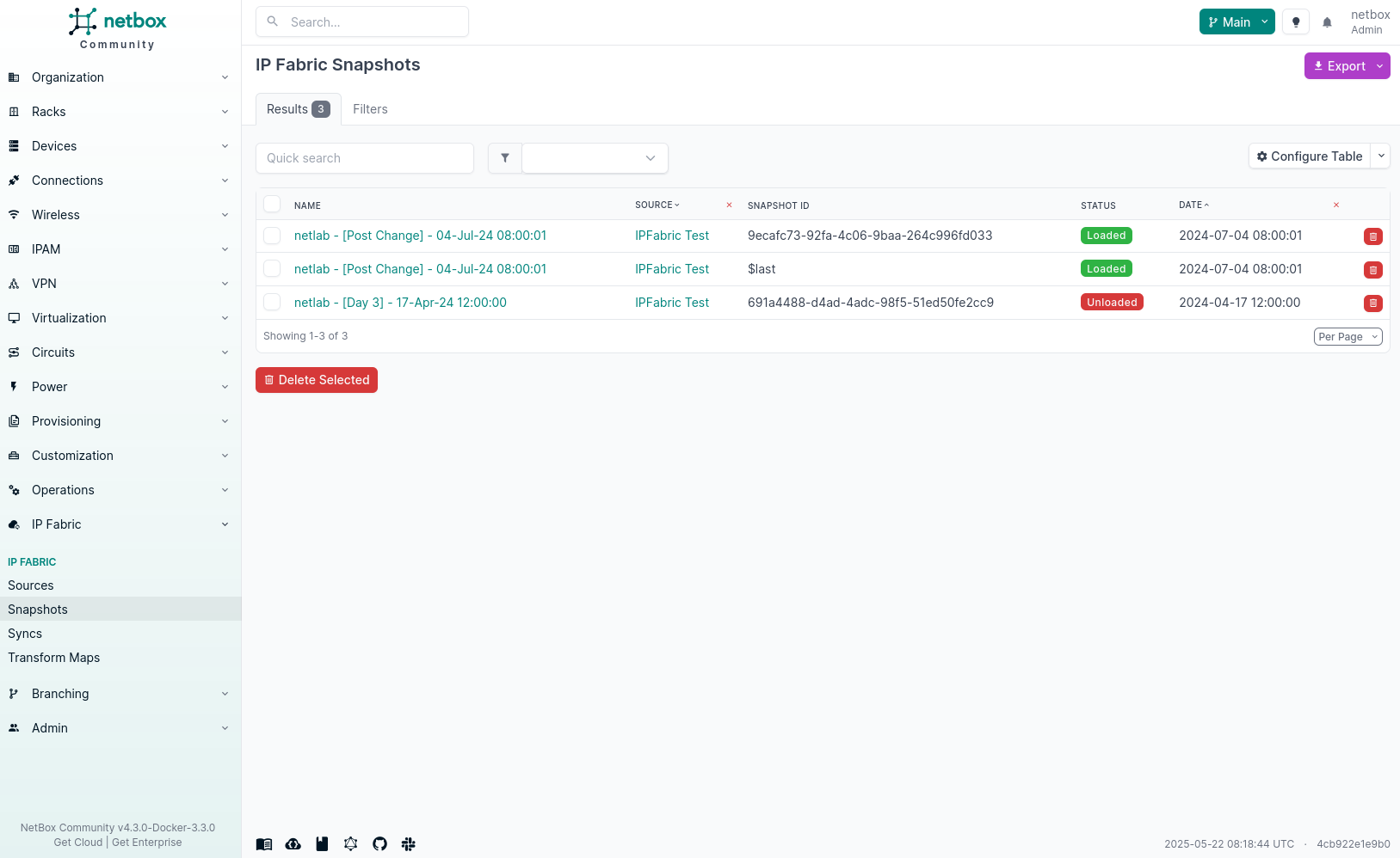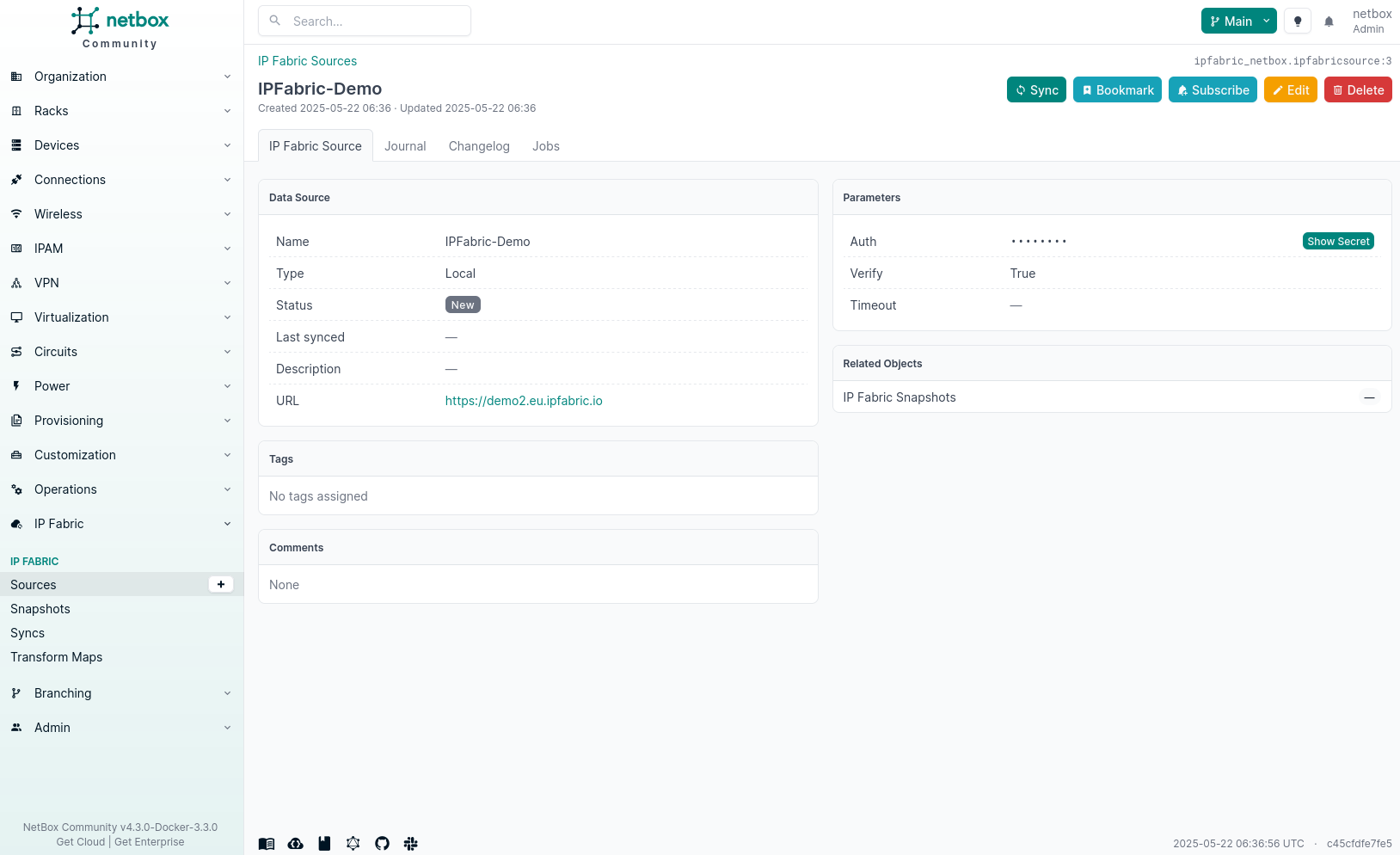 Once a source has been added to NetBox, it does not mean that data will be synchronized. NetBox does not know what snapshots to synchronize from IP Fabric. So first the snapshots must be synchronized.