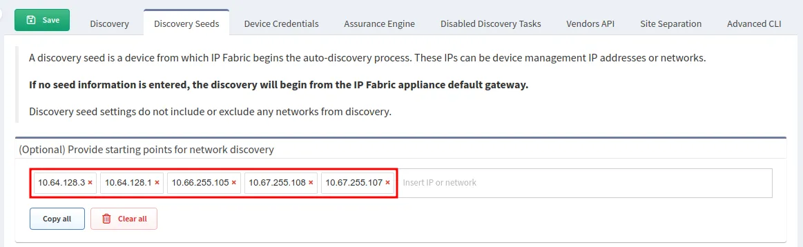 These are user-defined IP addresses that IP Fabric will try to connect to and discover. If a device is successfully discovered, it will check the settings in the Discovery tasks settings to see what technologies to use to discover neighbors.