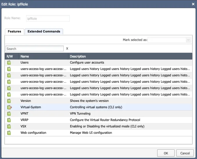 Click Add and fill in the name. In the Features tab, select all items and mark them as Read-Only. The following permissions from the Extended Commands tab are needed (only if Gaia acts as a management server):