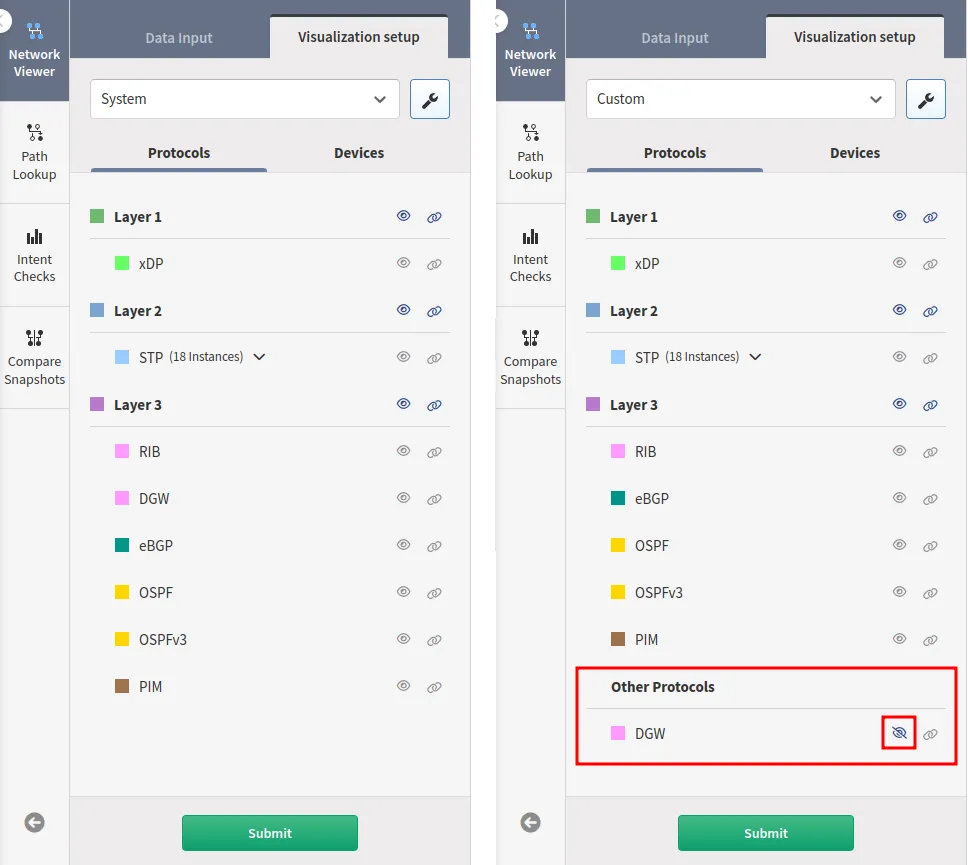 You can filter connection protocols between devices of the second and third layer of ISO OSI by using filters in the Network Viewer → Visualization setup → Protocols menu.