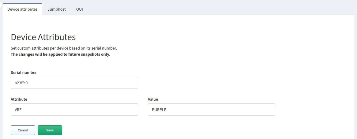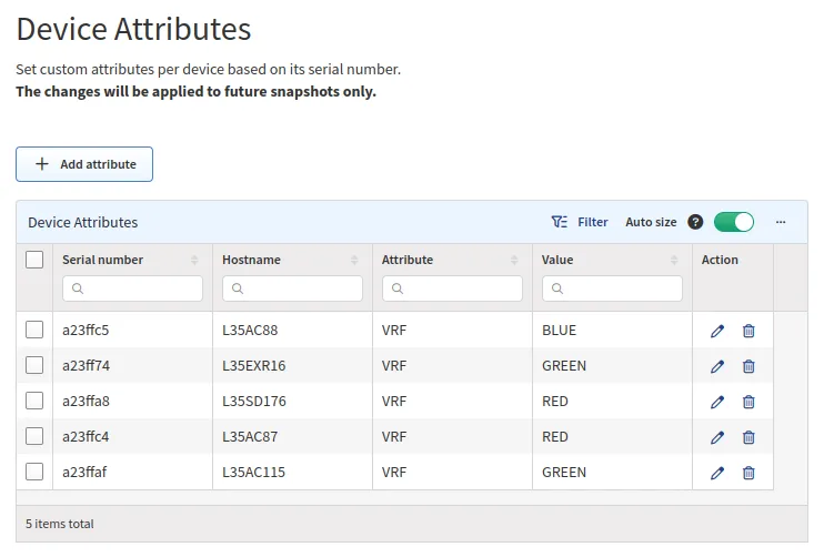 Attributes can be assigned globally or locally to an individual snapshot. To assign global attributes, navigate to Settings → Discovery & Snapshots → Global Configuration → Device Attributes. Once an attribute is assigned, a new snapshot is required for it to be applied.