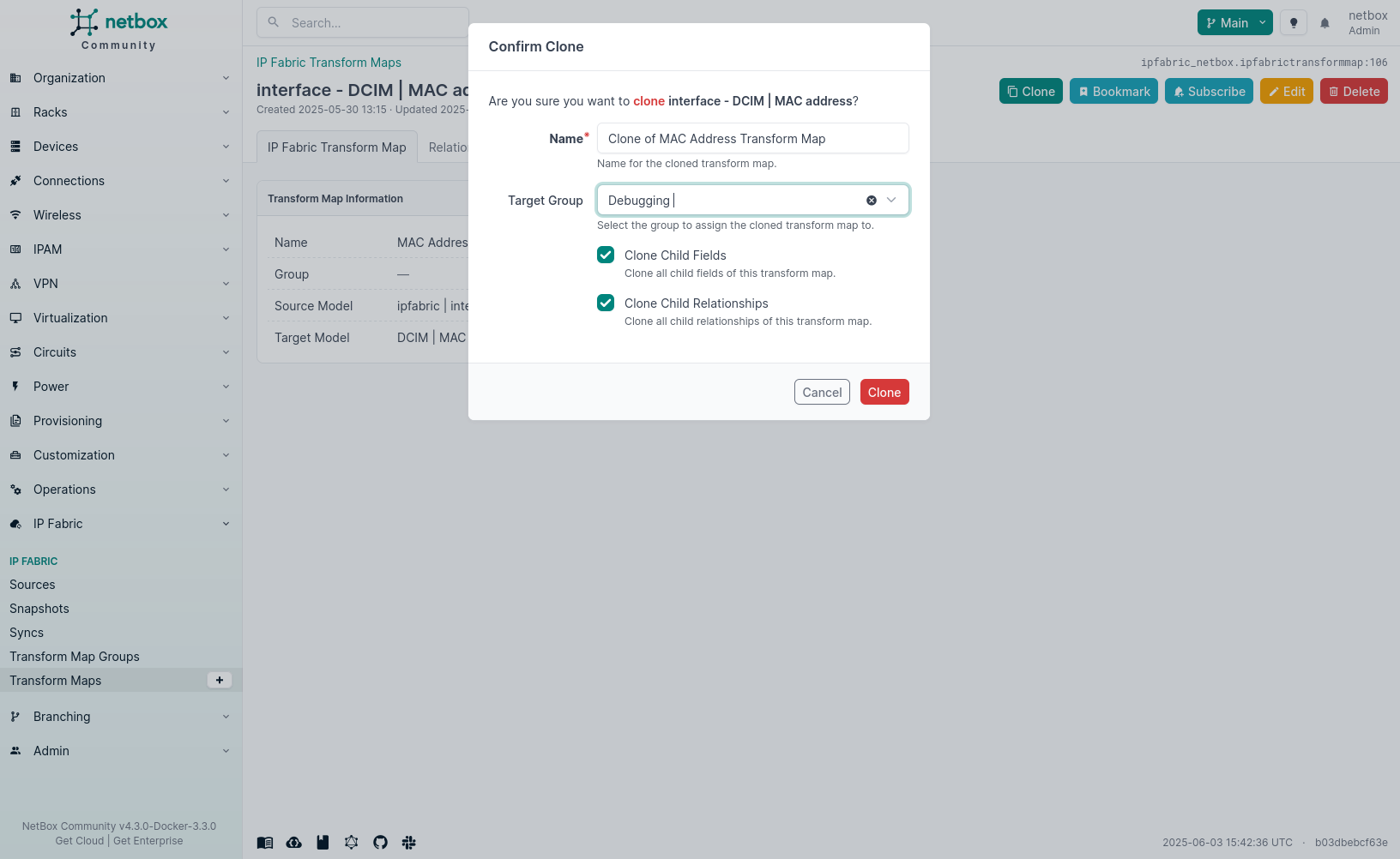You can clone a transform map by clicking the Clone button in the top-right corner of the transform map detail page. This will create a new transform map with the same source and target models. Cloning of related Fields and Relationships is enabled by default.