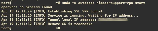 sudo -u autoboss nimpee-support-vpn start