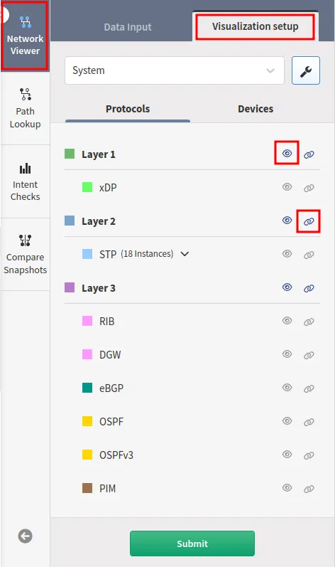 You can filter connection protocols between devices of the second and third layer of ISO OSI by using filters in the Network Viewer → Visualization setup → Protocols menu.