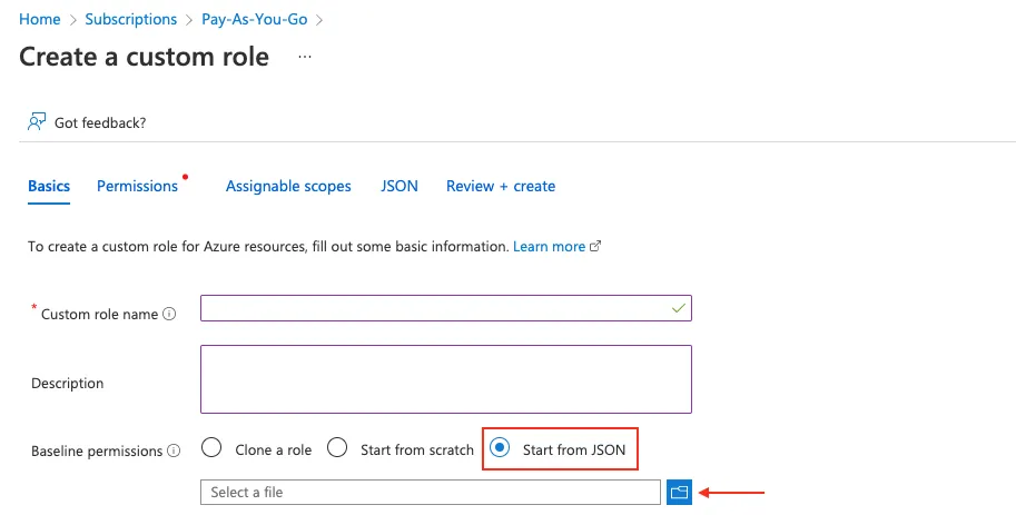 2. From the left menu, click Access control (IAM), click + Add, and then Add custom role. Fill in the role name. IP Fabric requires specific permissions to make API calls. Select Start from JSON and upload the JSON file with the required permissions (find it at the very bottom of this page). Click the Next button to continue.