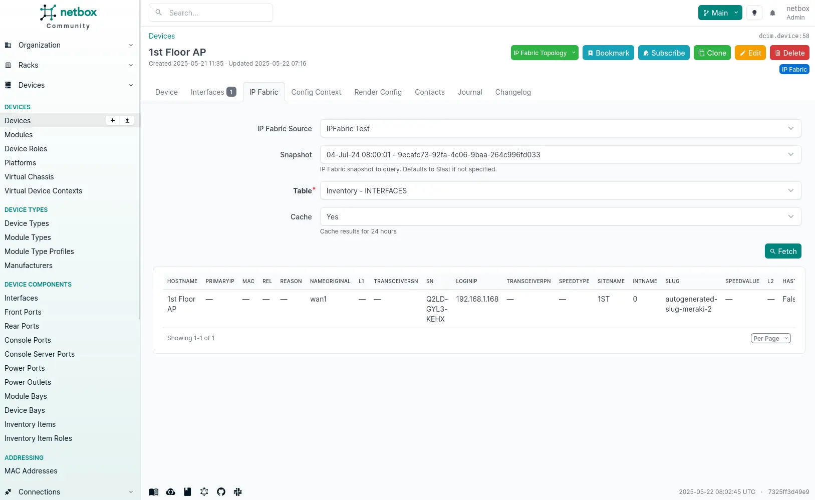 The cache can be used to store the data for a given device, allowing for faster lookups. This is enabled by default but can be disabled by unchecking the Cache checkbox. The cache will be updated every time the IP Fabric API is queried. The cache is stored for 24 hours.