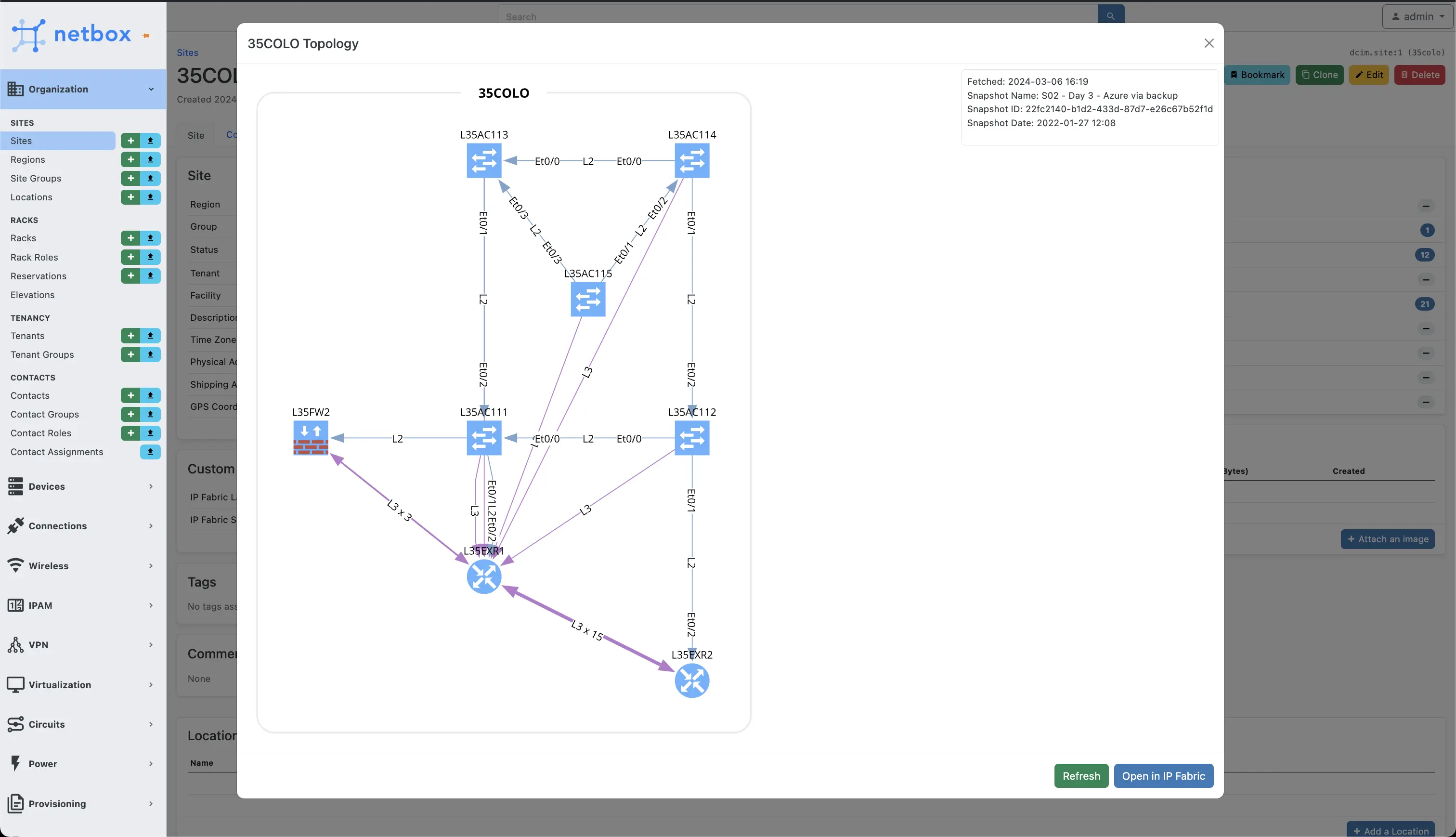 If sites have been synced with the plugin and have the IP Fabric Source custom field set a button will appear with the ability to get a topology of the $last or $prev snapshot. The will communicate with the IP Fabric API to generate a topology (SVG) for the site showing the devices and links between them. You can also use the link provided below to open the topology directly in IP Fabric for further analysis and interaction.
