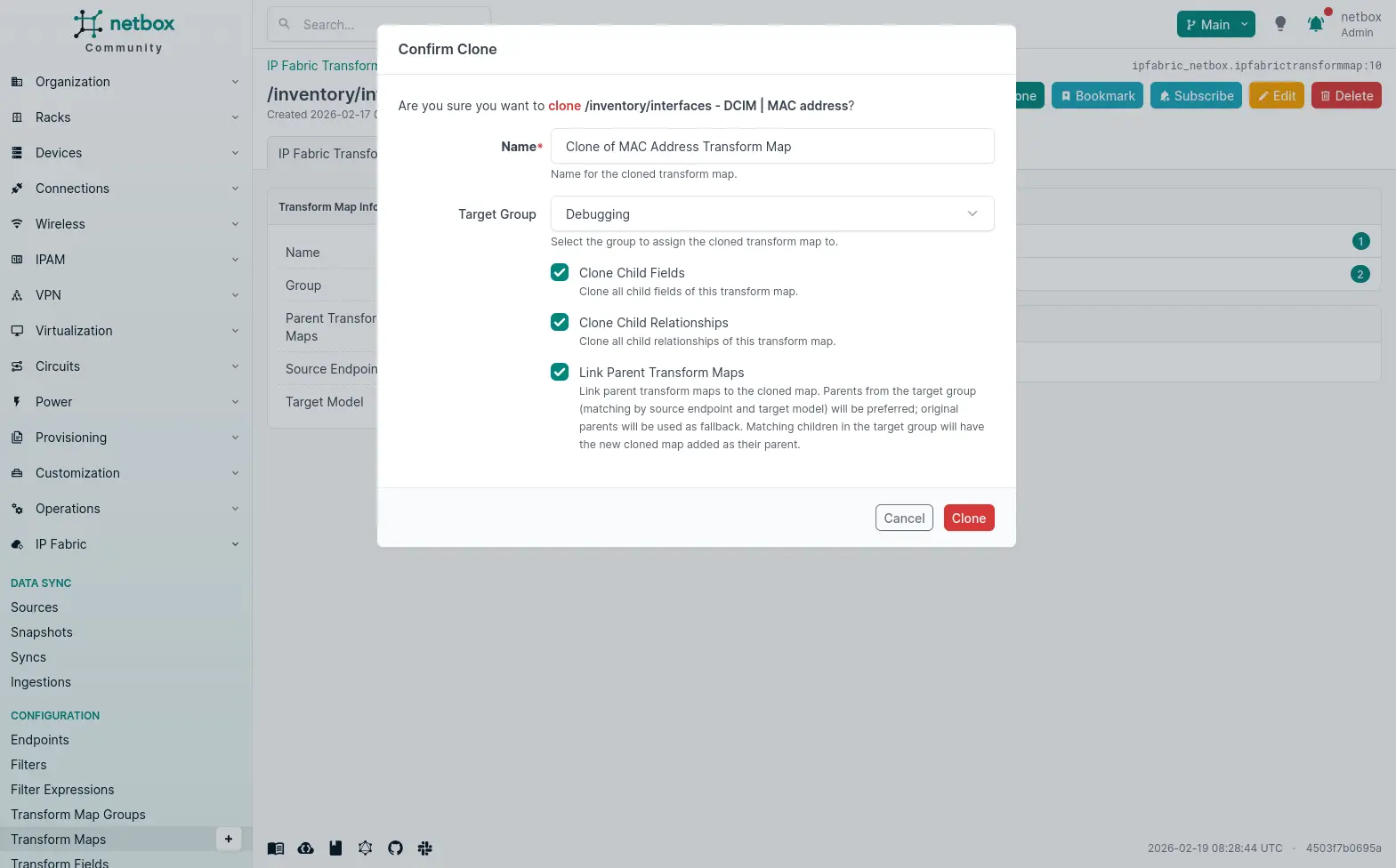 You can clone a transform map by clicking the Clone button in the top-right corner of the transform map detail page. This will create a new transform map with the same source and target models. Cloning of related Fields and Relationships is enabled by default.