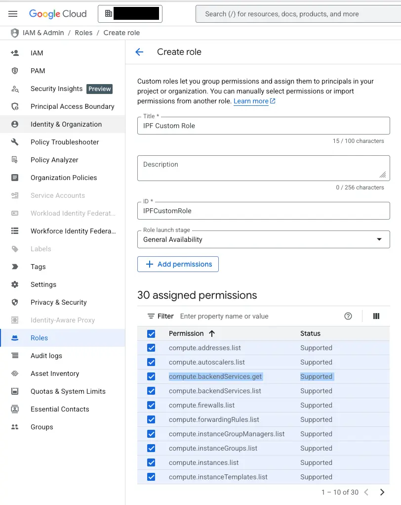 resourcemanager.projects.list (organization-level permission) resourcemanager.projects.get networkconnectivity.regionalEndpoints.get compute.addresses.list compute.autoscalers.list compute.backendServices.get compute.backendServices.list compute.regionBackendServices.get compute.regionBackendServices.list compute.firewalls.list compute.forwardingRules.list compute.instanceGroupManagers.list compute.instanceGroups.list compute.instanceTemplates.list compute.instances.list compute.interconnectAttachments.list compute.networkEndpointGroups.list compute.networkEndpointGroups.get compute.networks.list compute.routers.get compute.routers.list compute.routes.list compute.serviceAttachments.list compute.subnetworks.list compute.targetGrpcProxies.list compute.targetHttpProxies.list compute.targetHttpsProxies.list compute.targetTcpProxies.list compute.targetVpnGateways.list compute.urlMaps.list compute.vpnGateways.list compute.vpnTunnels.list compute.zones.listAdditional roles for IP Fabric version 7.9 and above: