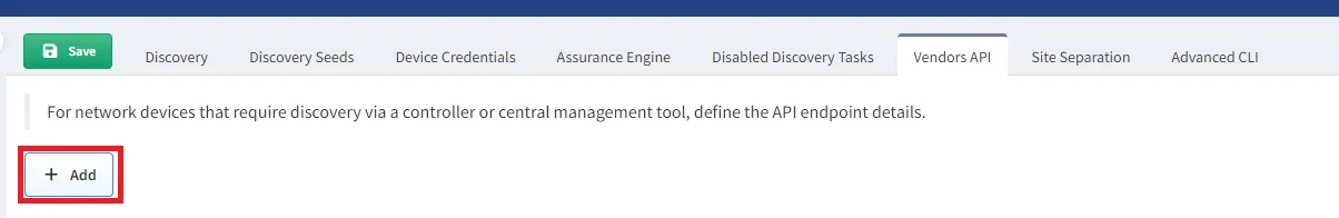In the IP Fabric GUI, navigate to Settings → Discovery & Snapshots → Discovery Settings → Vendors API, and click + Add: