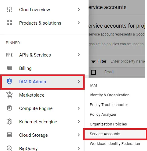 Navigate to IAM & Admin → Service Accounts: