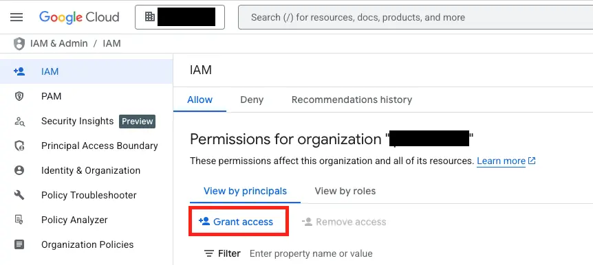 Navigate to IAM & Admin → IAM, and click Grant access: