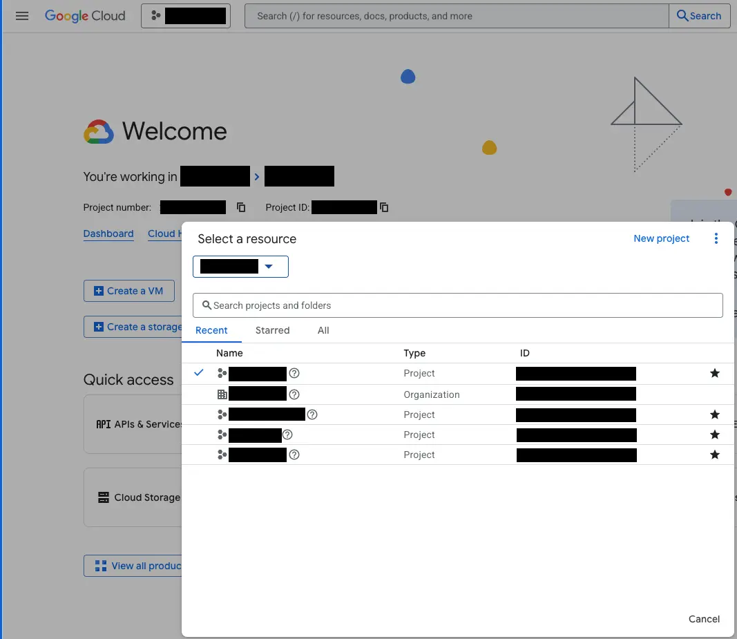 Select a project for which you want to create a service account: