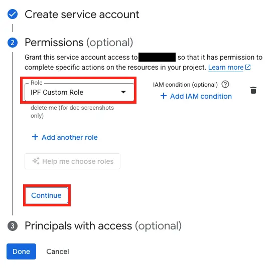 Enter the Service Account email address and assign the custom role: