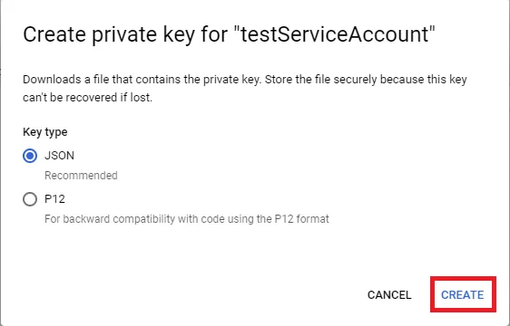 JSON. Click CREATE, and the private key will be downloaded to your computer.