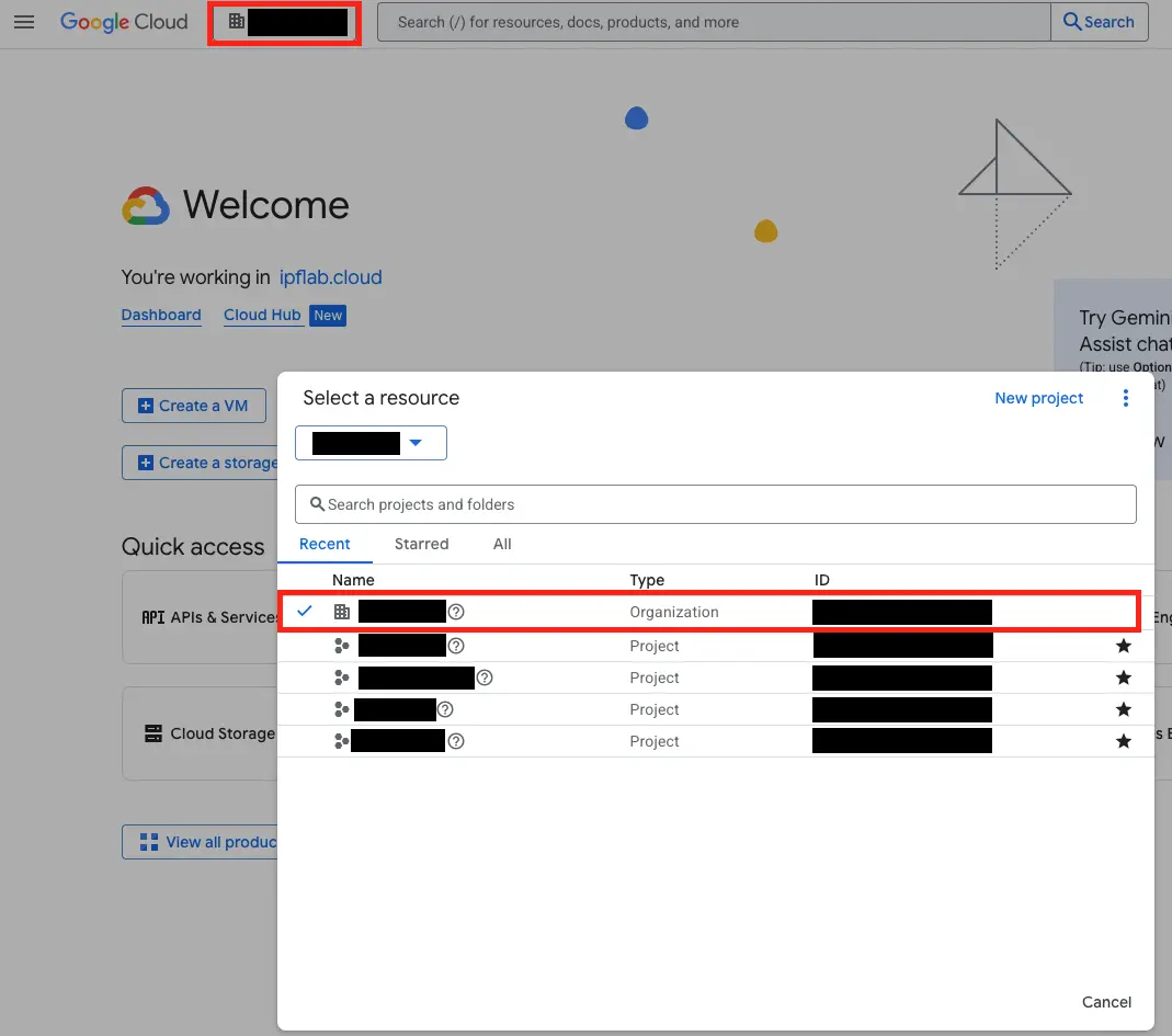Select your organization. (Alternatively, you can perform this step within individual projects.):